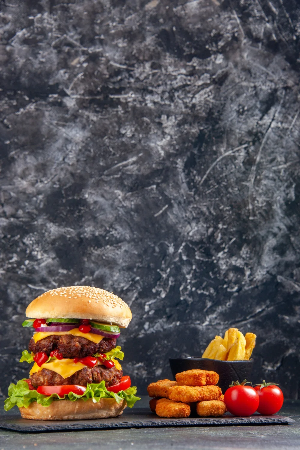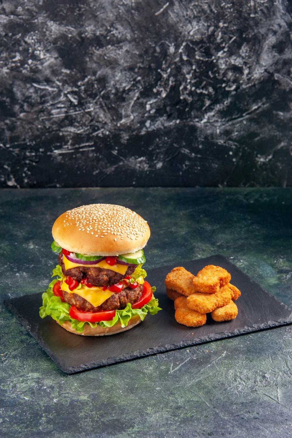 Pão de gergelim, dois hambúrgueres de carne grelhada, queijo cheddar, alface, tomate, cebola roxa, pepino fatiado, ketchup artesanal, acompanhado de nuggets crocantes e batatas fritas.