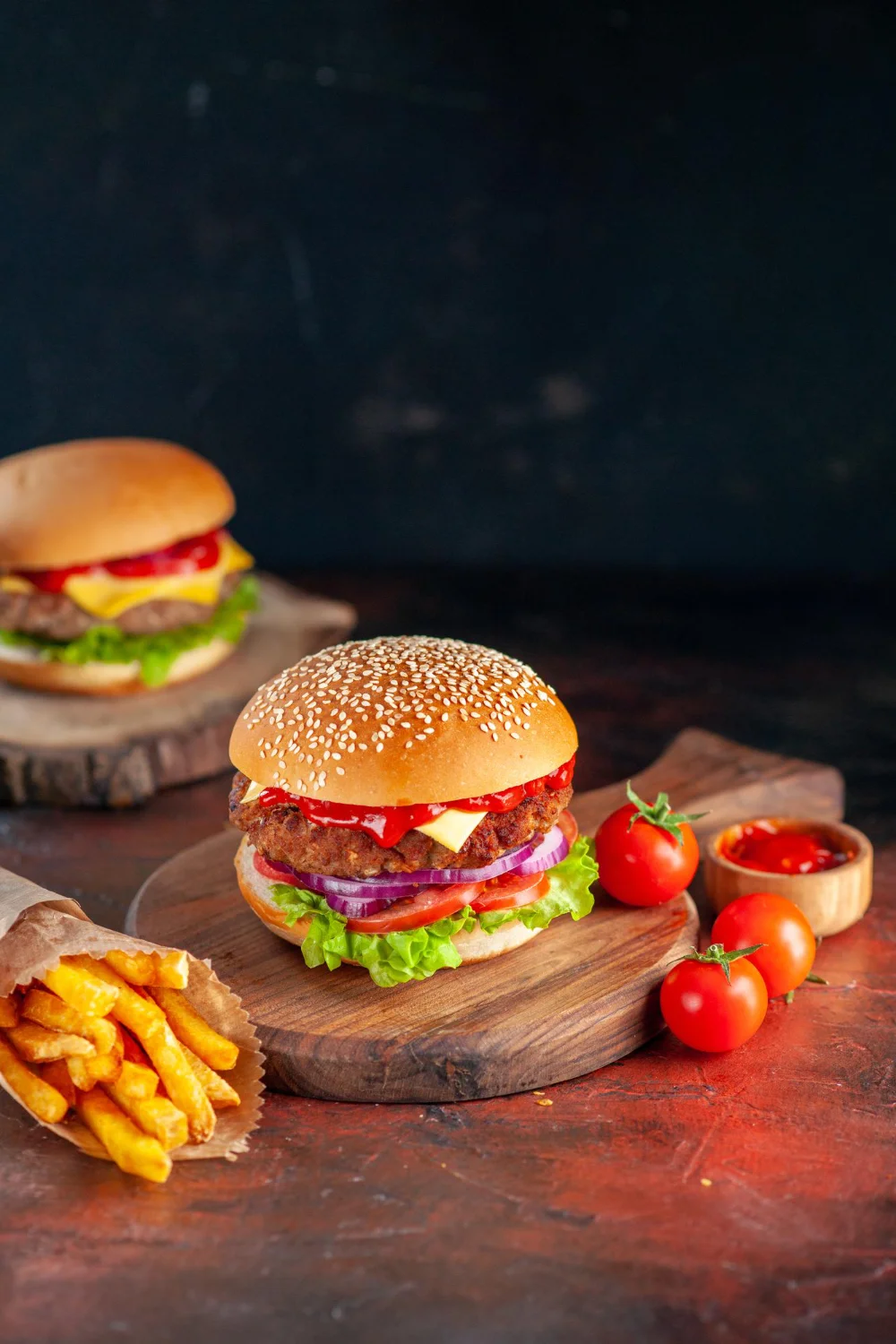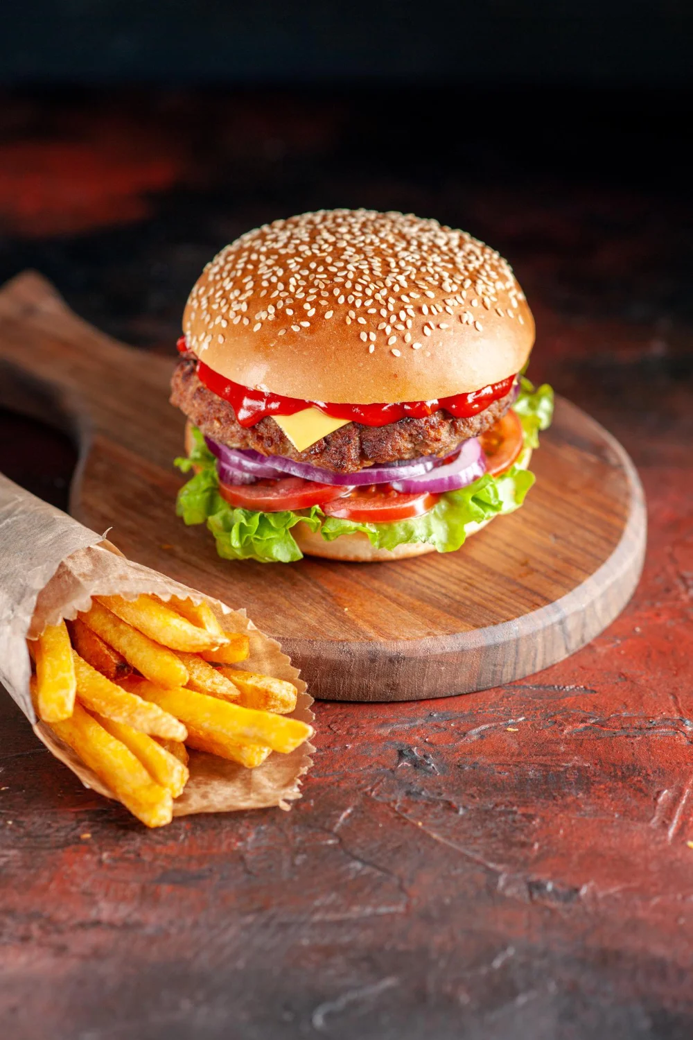 Pão de gergelim, hambúrguer de carne grelhada, queijo cheddar, ketchup, cebola roxa, tomate fresco, alface americana e batatas fritas crocantes.