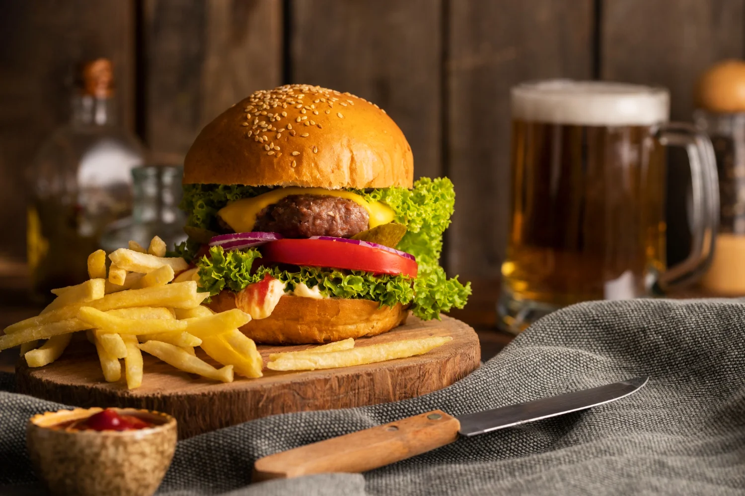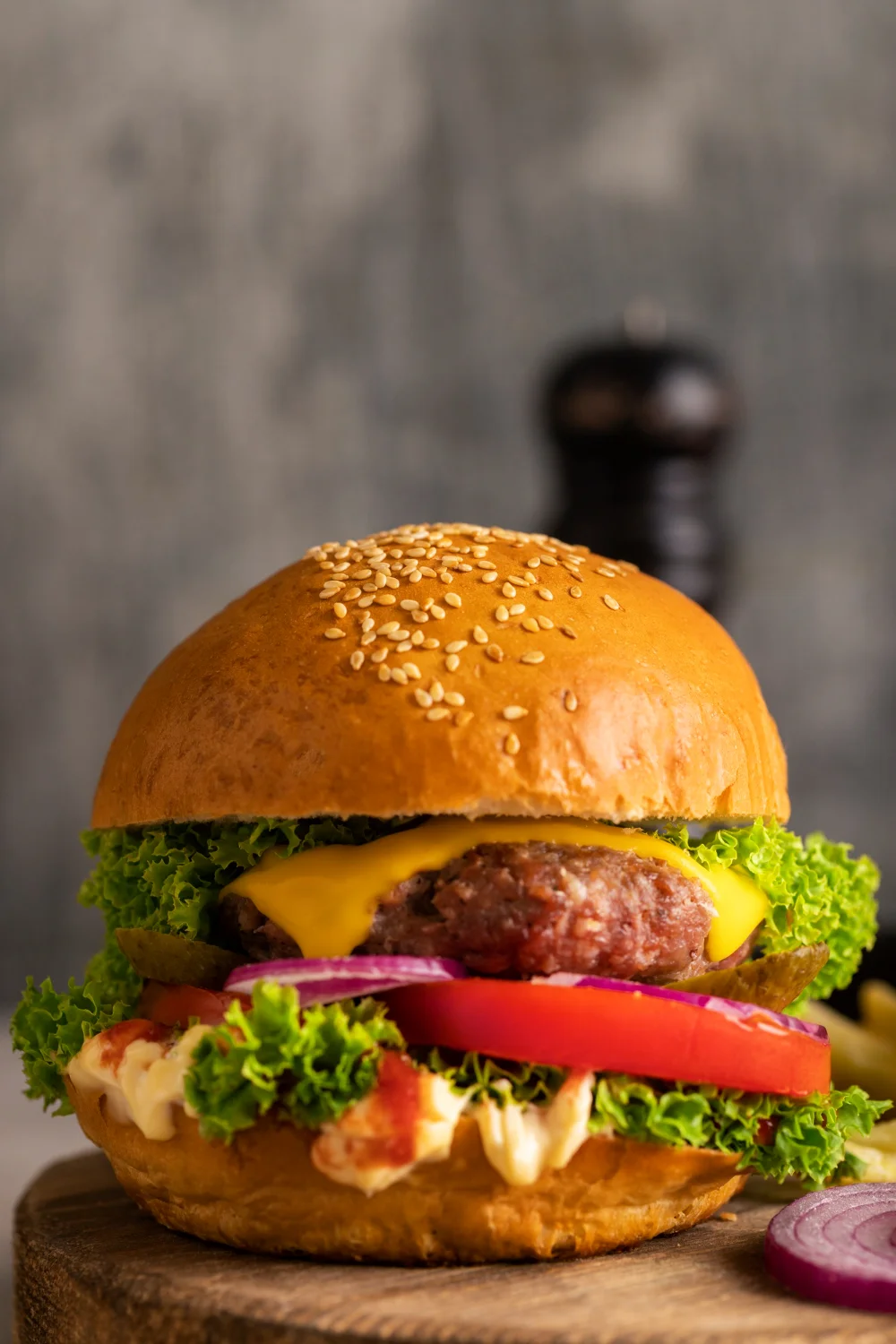 O Rustic Classic Burger é a perfeita harmonia entre simplicidade e sabor. Preparado com ingredientes frescos, combina um hambúrguer artesanal grelhado com queijo cheddar derretido, alface crocante, tomate fresco e cebola roxa, tudo sobre um pão macio de gergelim. Acompanhado por batatas fritas douradas e ketchup, este hambúrguer celebra os sabores clássicos com um toque rústico e acolhedor, ideal para qualquer ocasião.